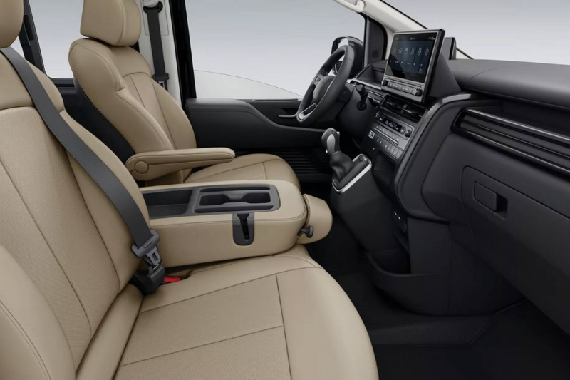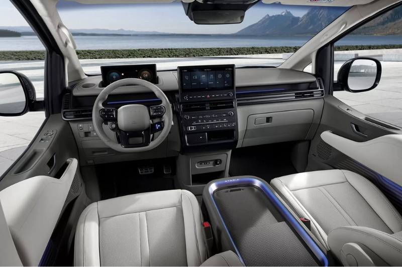 Nội thất Hyundai Staria 2026 mang đến cảm giác hoàn toàn khác biệt. Bảng táp lô được thiết kế lại theo phương ngang, tối ưu không gian và tầm nhìn. Cụm màn hình kép 12,3 inch (đồng hồ kỹ thuật số + giải trí trung tâm) thay thế màn hình 10,25 inch trước đây, mang đến trải nghiệm công nghệ hiện đại hơn.