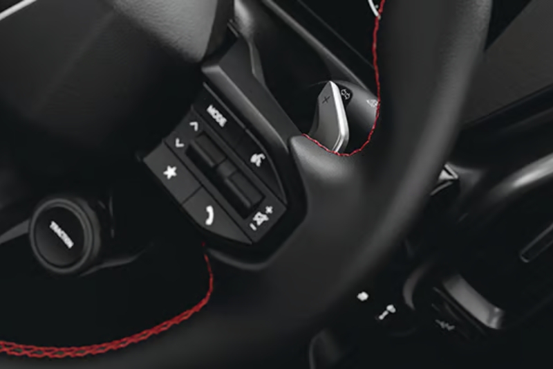 Vô-lăng 3 chấu bọc da, bàn đạp kim loại, bệ tỳ tay khâu chỉ đỏ, cùng cụm chuyển chế độ lái mang phong cách xe hiệu năng cao giúp người lái cảm nhận rõ tinh thần thể thao trong từng chi tiết.