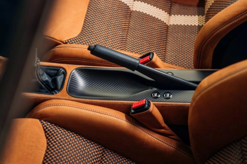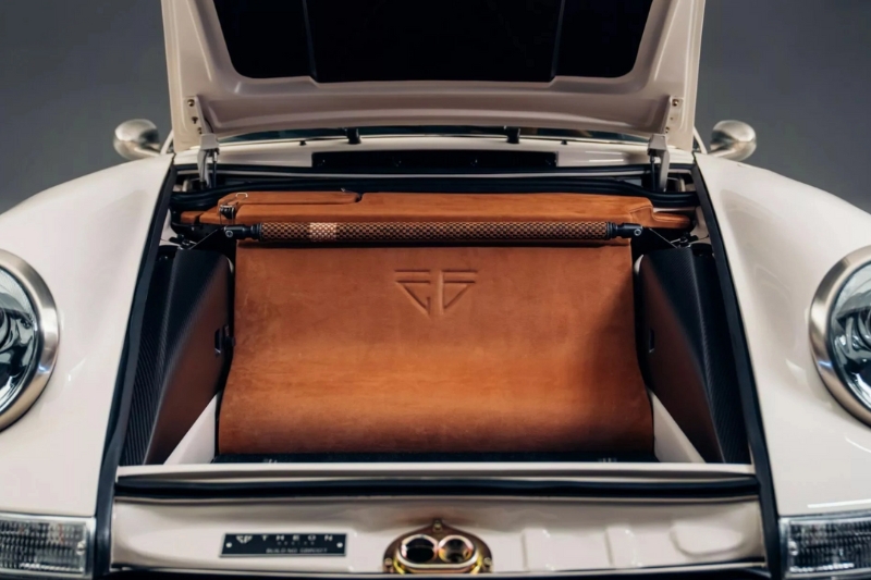 Khoang cabin được hoàn thiện theo phong cách retro sang trọng, nổi bật với ghế Recaro CS khung carbon bọc da nâu, chỉ khâu Ivory đồng màu ngoại thất. Các chi tiết nhựa nguyên bản được thay thế bằng nhôm CNC cao cấp, đi kèm hệ thống âm thanh Focal và ampli Audison, mang lại trải nghiệm vừa cổ điển vừa hiện đại.